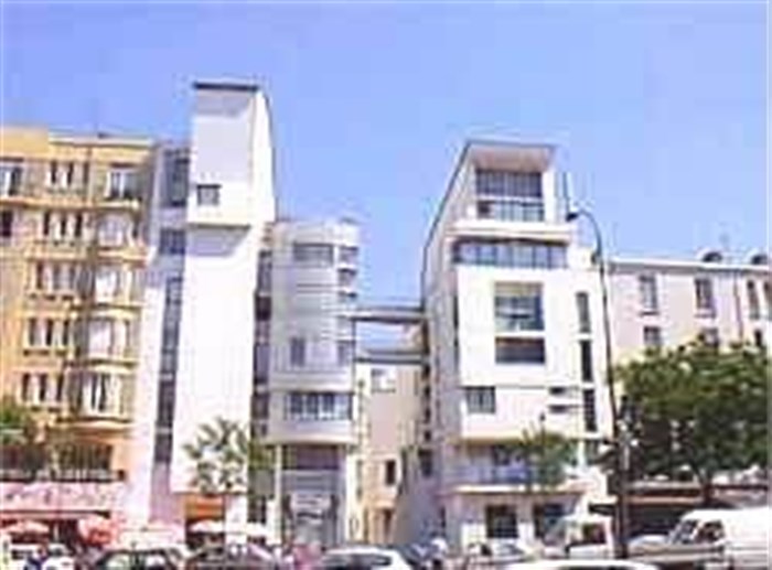 L'église Notre-Dame-de-la-Réconciliation, paroisse tamoule. Le contraste architectural entre les modestes maisons de cette banlieue rattachée à Paris en 1860 et des bâtiments futuristes ("le Paquebot" de Frédéric Borel).