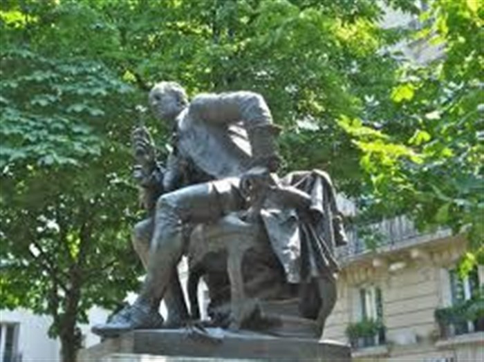 La statue de Diderot, bd Saint-Germain, exilée à la demande de Cazes, patron de Lipp, brasserie située face à la maison détruite de a rue Taranne où l'écrivain a vécu de 1754 à 1784;