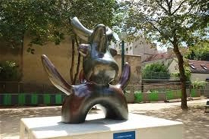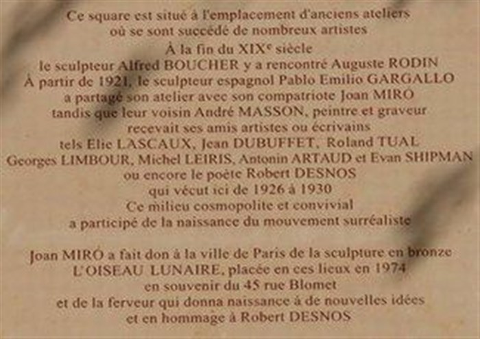 Le square de l'oiseau Lunaire cadre d'une statue offerte par Joan-Miró à l'emplacement d'un immeuble où ont vécu et travaillé Gargallo Miró, Desnos.