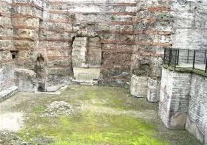 Accès aux salles souterraines, réservées au personnel comportant les magasins où étaient entreposés le bois destiné aux fours et le matériel de toilette. Des murs et des voûtes biens conservés permettent de décrire le mode de construction romain dont le gros oeuvre repose sur le blocage, mélange de mortier et cailloux analogue au béton. Technique qui, d'après Viollet-le-Duc permet l'emploi d'une main d'oeuvre d'esclaves peu qualifiée.