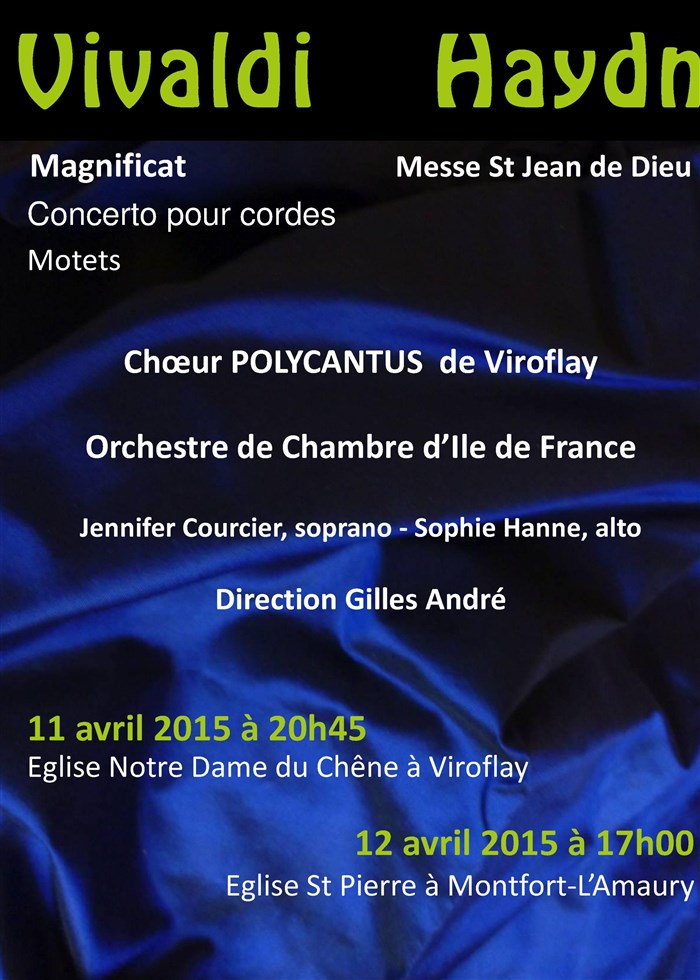 Un événement musical qui doit retenir l'attention de tous les mélomanes avec au programme le Magnificat et autres Motets d'Antonio Vivaldi, et la Messe Brève de St Jean de Dieu de Joseph Haydn. Le choeur Polycantus et deux solistes talentueuses seront accompagnées par l'Orchestre de Chambre d'Ile de France (ensemble Jean-Walter Audoli).