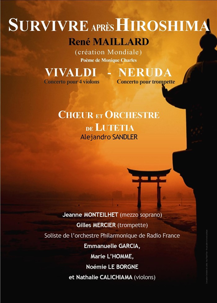 Le chef Alejandro Sandler et l'Orchestre de Lutetia présentent en création mondiale, Survivre après Hiroshima, l'oeuvre pleine d'espoir de René Maillard sur un poème de Monique Charles. " Cette Cantate est une oeuvre marquante dans laquelle sont rassemblées toutes les qualités du compositeur: sensibilité, richesse de la palette orchestrale, écriture intemporelle, classique mais riche en idées nouvelles" (Denis Havard de la Montagne). C'est l'histoire de Kyoko Hama âgée de 20 ans en 1945, fuyant les bombardements d'Osaka, pour se réfugier à Hiroshima, au matin de l'explosion de la première bombe atomique. "J'ai été tellement ému du récit de Yoko, sa fille, que j'ai décidé d'écrire une Cantate. Cette émotion ne m'a pas quitté de toute la période où je l'ai composée. C'est un message d'espoir, contre la haine et la guerre, un hymne à la vie sur notre terre, où il fait si bon vivre et aimer" (raconte René Maillard).