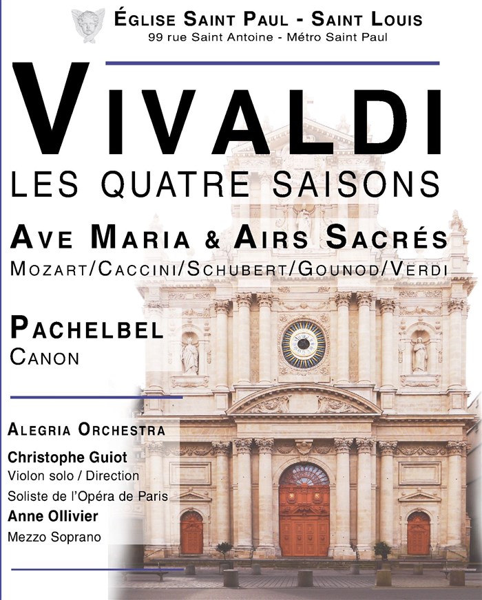 Les Quatre Saisons de Vivaldi, le Canon de Pachelbel Concert et des Ave Maria et Airs sacrés de Mozart, Caccini, Schubert, Gounod, Verdi.
