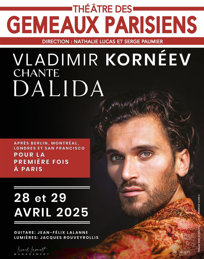 Chanteur et acteur d'origine géorgienne qui a déjà séduit le public de Berlin à San Francisco en passant par Montréal et Bruxelles avec ses interprétations de grandes chansons françaises (Aznavour, Brel, Piaf ainsi qu'avec le répertoire de Kurt Weill), Vladimir Kornéev rend maintenant hommage à l'unique Dalida.