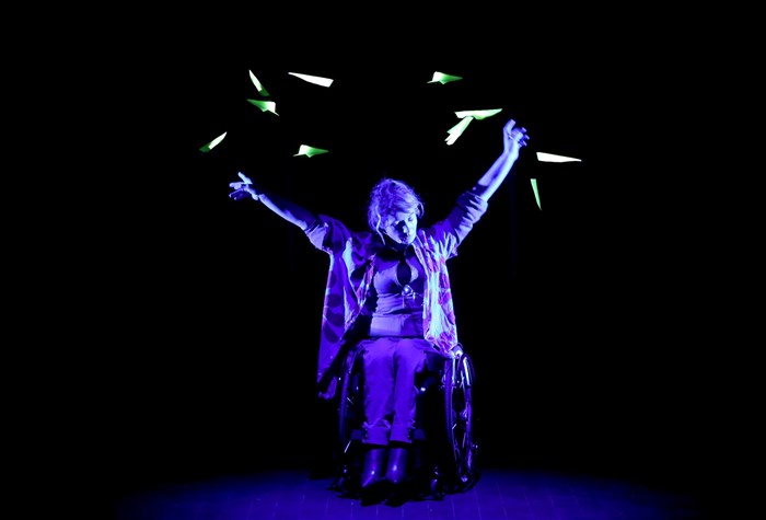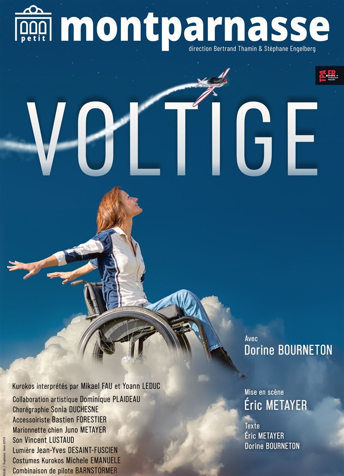 Entre théâtre et danse, le spectacle retrace son envol : un voyage de force, de colère et de rire dans lequel le corps et le rêve défient la gravité. Portée par les mystérieux Kurokos du théâtre japonais, la scène devient avion, obstacle ou vague... Le monde intérieur d'une femme qui a choisi de se dépasser et de voler, envers et contre Voltige raconte le destin exceptionnel de Dorine Bourneton.
