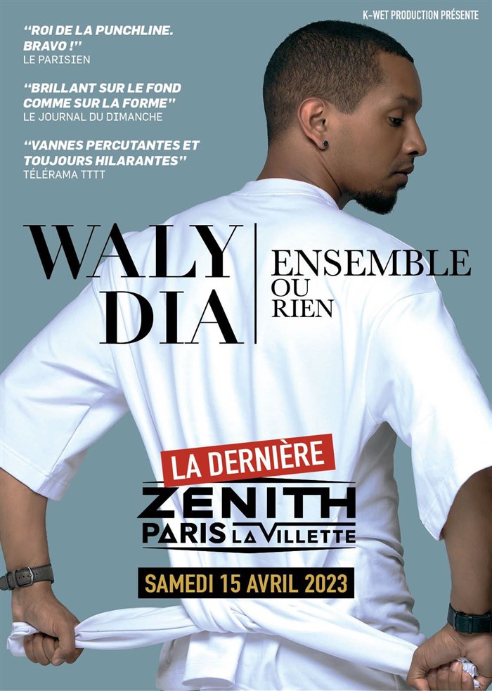 Après 4 ans de tournée à guichets fermés, Waly Dia s'empare du Zénith de Paris le 15 avril 2023 pour la dernière de son spectacle "Ensemble Ou Rien"
