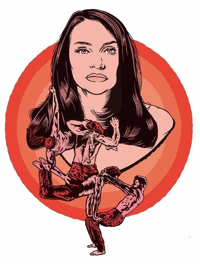 Micro à la main, Béatrice Dalle ordonne le face-à-face. Elle dirige deux acrobates, l'un voltigeur, l'autre porteur.