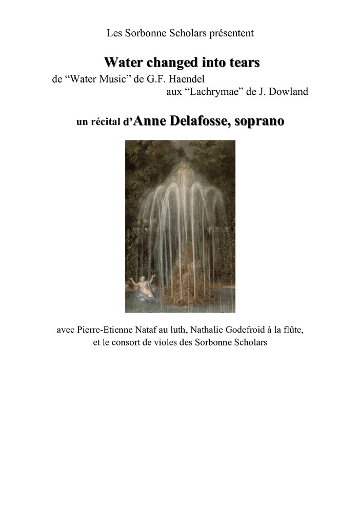 Récital d'Anne Delafosse, soprano. Water changed into tears : de "Water Music" de G. F. Haendel aux "Lachrymae" de J. Dowland.