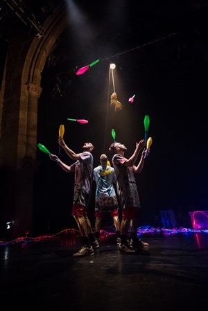 "Water on Mars" est un concentré de pur jonglage. C'est une performance créée par trois extra-terrestres américano-suédois, qui ont chacun passé plus de 15 ans à chercher comment combiner jonglage et musique.