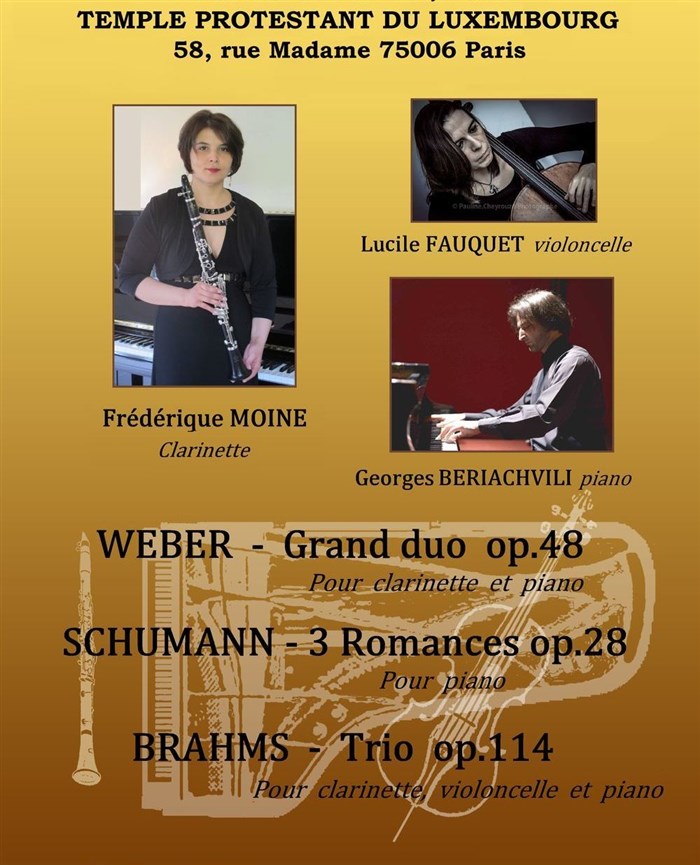 Trois joyaux de musique de chambre allemande par Frédérique Moine à la clarinette, Georges Bériachvili au piano et Lucile Fauquet au violoncelle.
