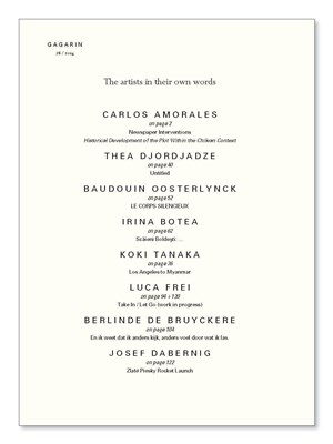 Gagarin est un projet intégralement dédié aux écrits d'artistes qui travaillent aujourd'hui, partout dans le monde. Les textes sont écrits pour Gagarin et publiés dans leur langue originale, accompagnés de leur traduction intégrale en anglais. Gagarin est publié deux fois par an depuis l'an 2000 et documente les premières décennies de ce siècle à partir d'écrits d'artistes. Gagarin est destiné à ceux qui n'ont pas tendance à attendre que tout soit accepté et synthétisé, à ceux qui sont prêts à sortir des chemins battus, à la recherche d'un art stimulant et d'idées fraîches. Gagarin ne se limite pas à une période ni aux codes en vigueur dans le monde de l'art. Son orientation est artistique, documentaire et historique. Gagarin aspire également à fournir une source d'informations fiable sur des collaborations artistiques en utilisant leurs propres mots.