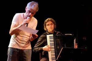 Soirée en l'honneur du Prix Goncourt de Poésie 2015, William Cliff, qui se produit sur scène avec l'accordéoniste Frédéric Daverio.