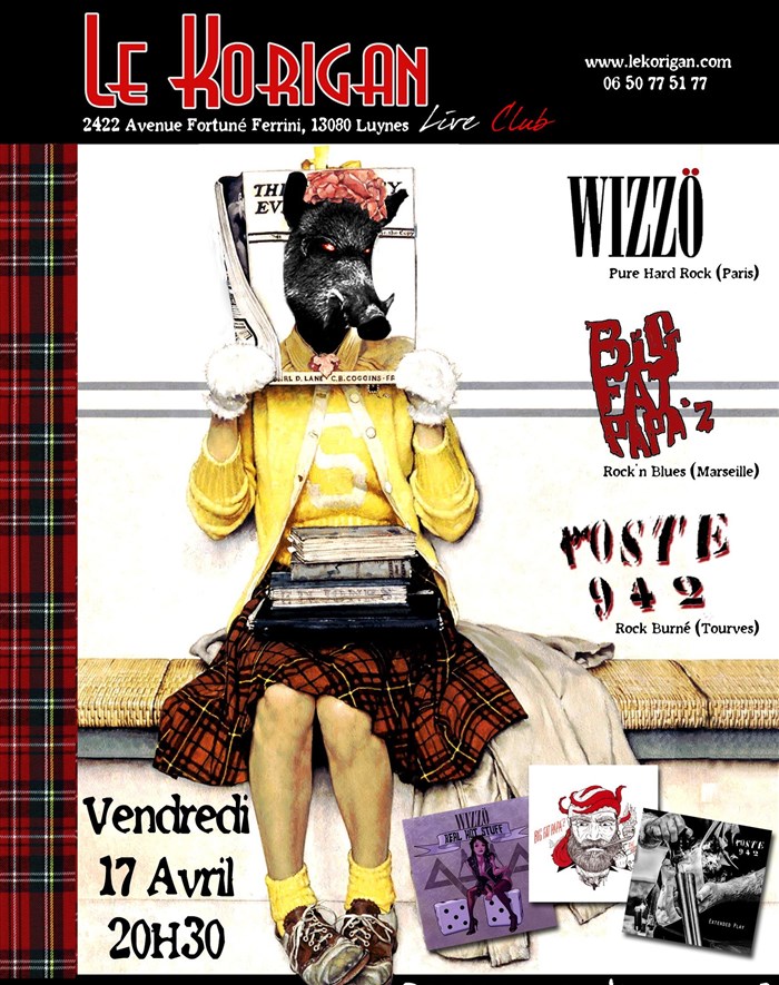 Trois groupes Wizzö, Poste 942 et Big Fat Papa'Z seront présents sur la scène de Le Korigan pour cette soirée Rock !