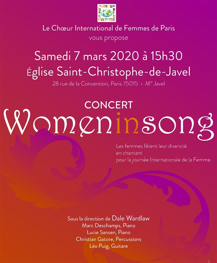 Le succès des concerts " Women in Song " est le résultat cumulatif d'un répertoire riche en diversité, de répétitions denses et énergiques, et de femmes curieuses, intéressées et ouvertes aux échanges culturels et humains. Vous partez de ces concerts joyeux avec l'esprit léger et le sourire au coeur.
