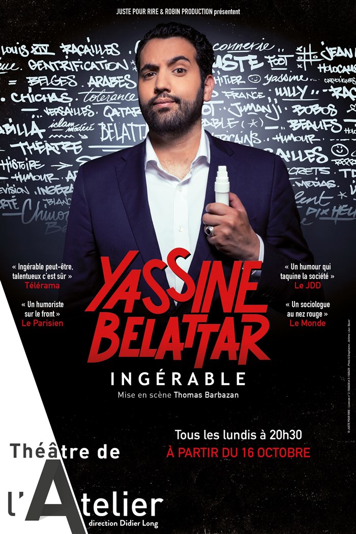 Après une tournée dans les endroits les plus sympathiques (Molenbeek, les villes Front National,...) et après avoir été le Premier humoriste à se produire au Bataclan depuis sa réouverture, Yassine Belattar revient encore plus Ingérable dans toute la France et à Paris.
