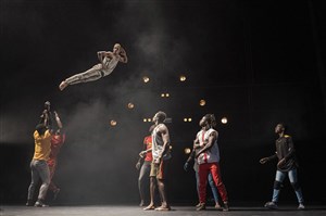 Mêlant acrobaties virtuoses, danses rituelles traditionnelles, pyramides humaines, breakdance et krump, les treize circassiens guinéens enflamment le plateau du Théâtre !