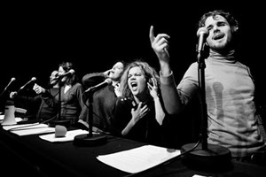 Voir plusCe spectacle est l'adaptation sous la forme de fiction radiophonique de la bande dessinée de Fabcaro. Les différents comédiens et comédiennes lisent le texte avec une ambiance sonore (bruitage et musique) réalisée en direct. On retrouve bien l'esprit de la BD : une histoire qui sous un abord loufoque se révèle une description critique de notre société. L'ensemble est surprenant, pertinent et drôle mais pourra sembler trop déconcertant pour certains...