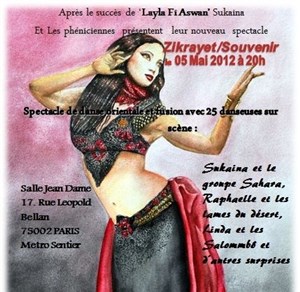 Après le succès de Layla Fi Aswan , les Phéniciennes, soit 25 artistes sur scène, sont de retour avec Zikrayet leur tout nouveau spectacle de danse aux tableaux originaux riches et variés (ATS tribal, danse orientale Sharki, Arabo andalous, melaya, Saidi, Drump Solo et pleins d autres surprises...).