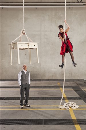 Depuis sa plus tendre enfance Esther Slanzi voulait devenir artiste de cirque. Depuis, elle a le goût des hauteurs. À la corde verticale, tel un petit oiseau suspendu à une branche, au trapèze ou au mât chinois, elle se joue de la gravité. Jonas Slanzi est acteur et circassien. Il s'est fait spécialiste de la manipulation d'objets. Elle et lui se rencontrent hantés par leur perception sensorielle. Lui est à la recherche de l'ordre parfait, elle aspire à la légèreté des élévations. Chacun a besoin de l'influence de l'autre pour atteindre ses desseins.